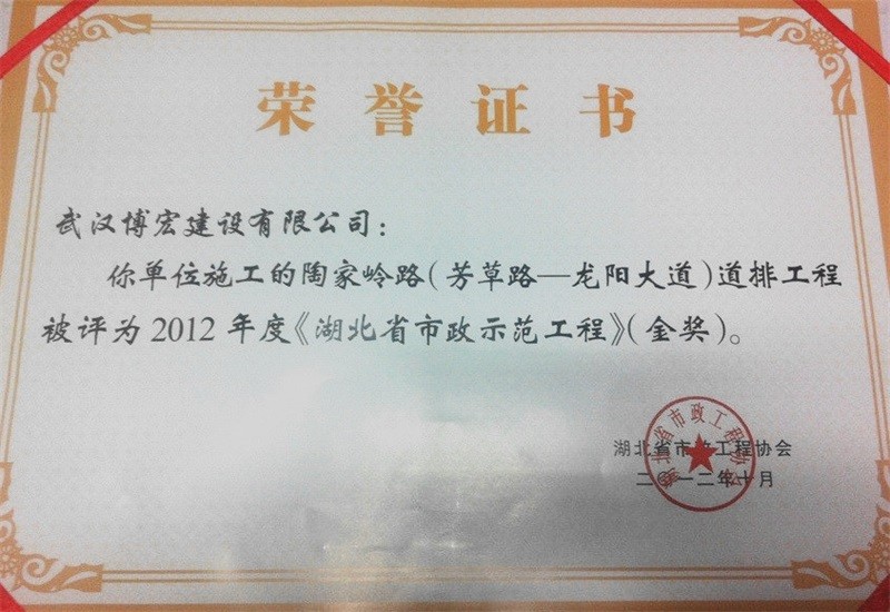 2012年度湖北省市政示范工程金獎(陶家?guī)X路道排工程)