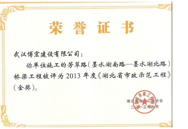 2013年度湖北省市政示范工程金獎(芳草路橋梁工程)