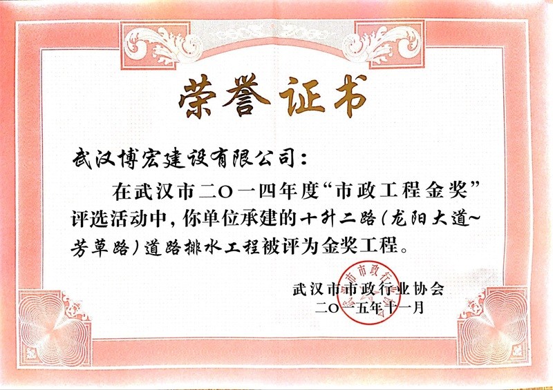 2012年度武漢市市政工程金獎(芳草路道路排水工程)