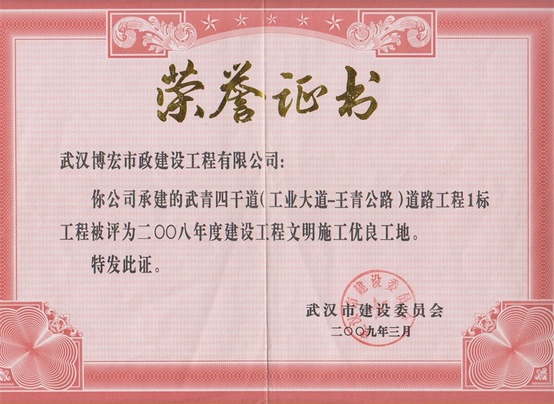 2008年度武漢市建設工程文明施工優(yōu)良工地(武青四干道道路工程一標)