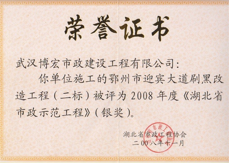 2008年度湖北省市政示范工程銀獎(鄂州市迎賓大道刷黑改造工程二標)
