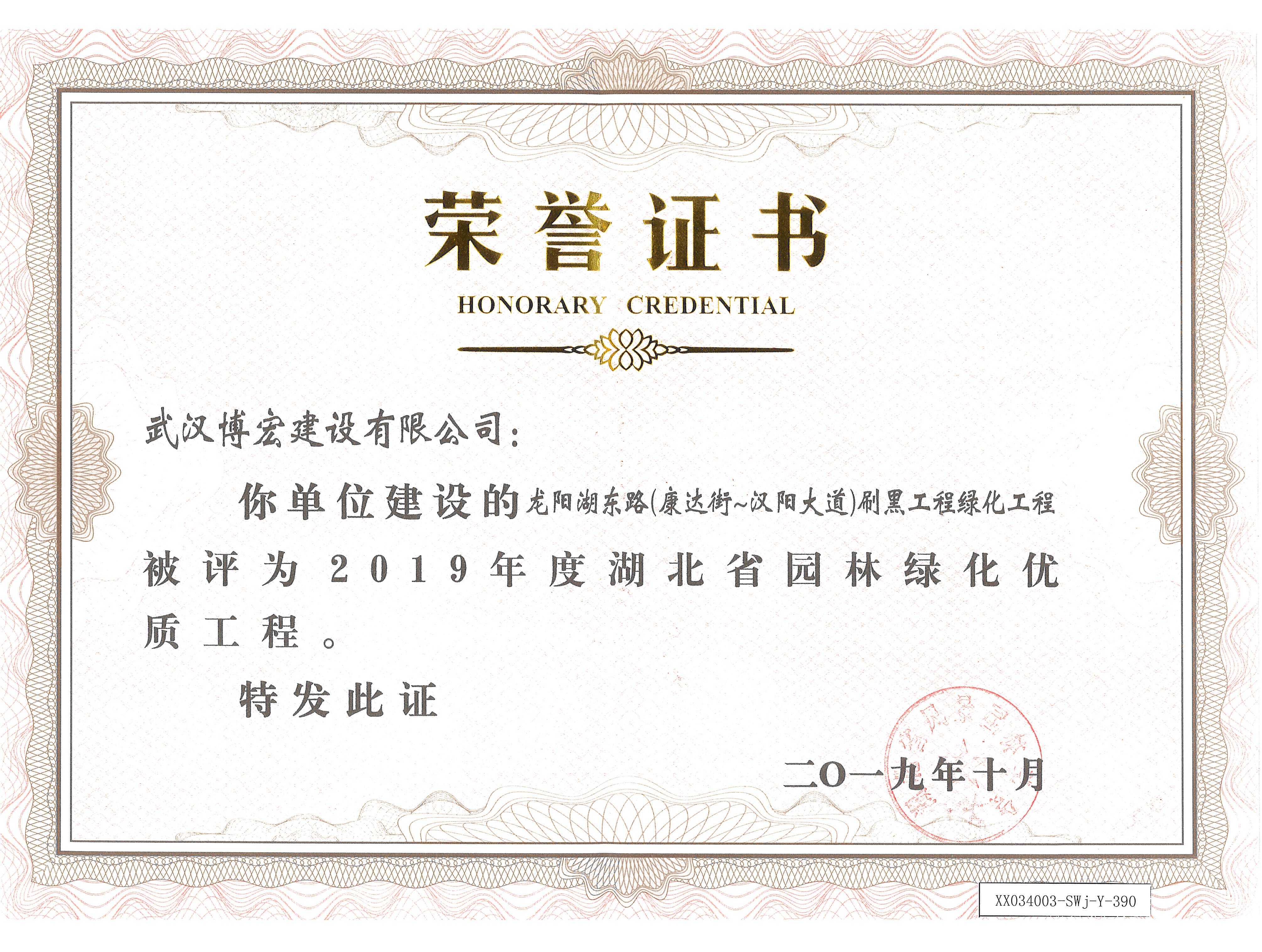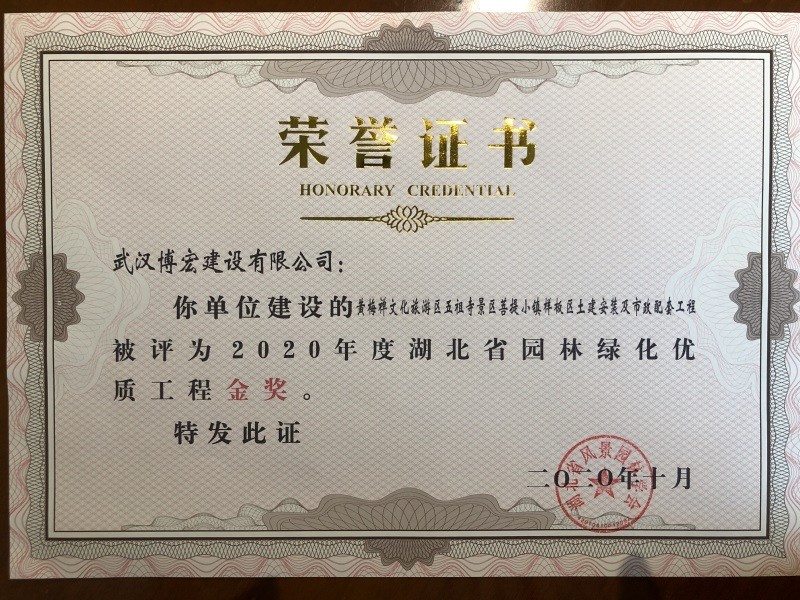 2020湖北省城市園林綠化優(yōu)質(zhì)工程金獎獎狀