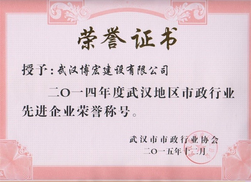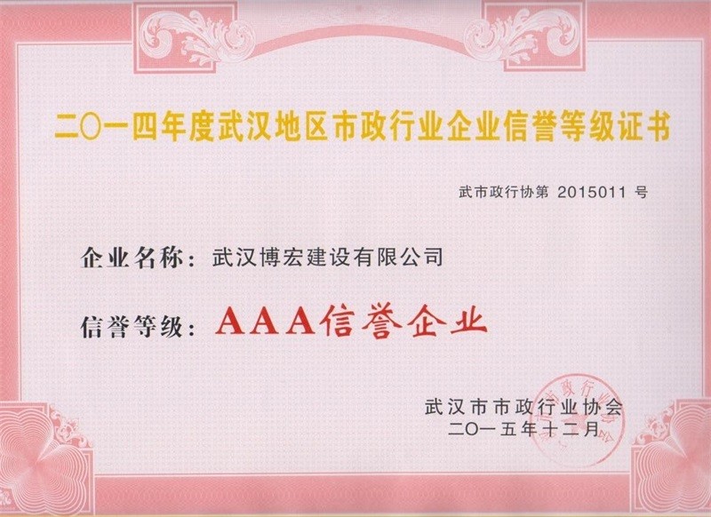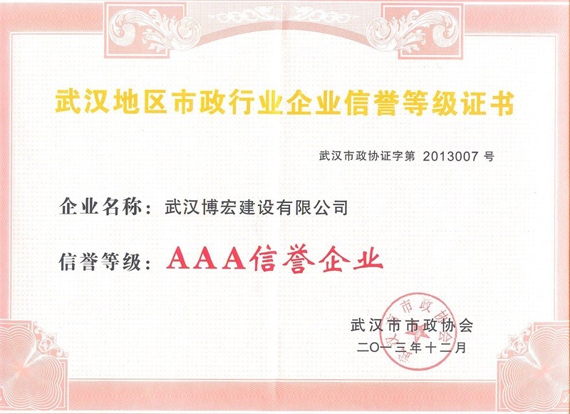 2013年度武漢地區(qū)市政行業(yè)企業(yè)信譽(yù)等級(jí)證書(shū)