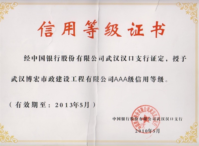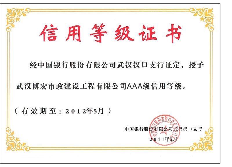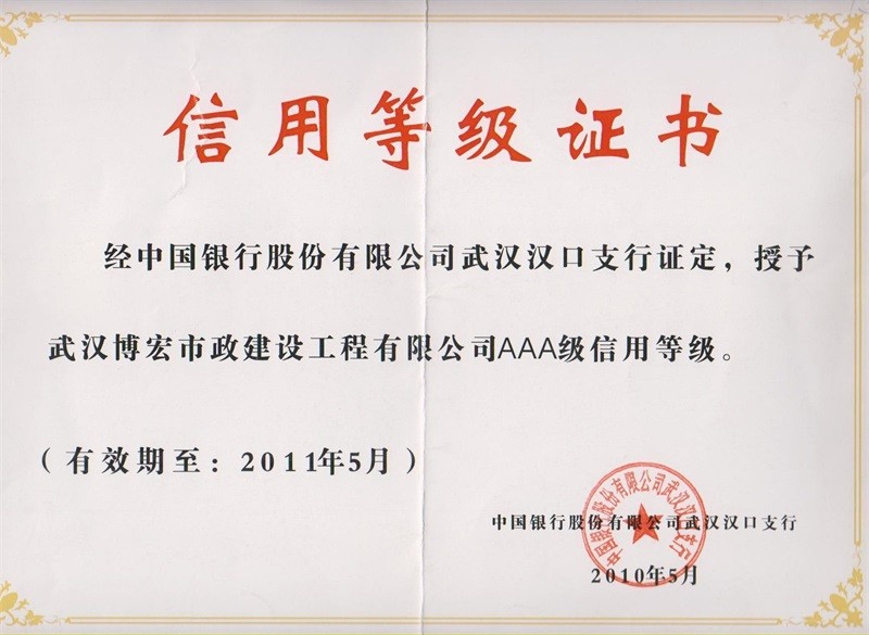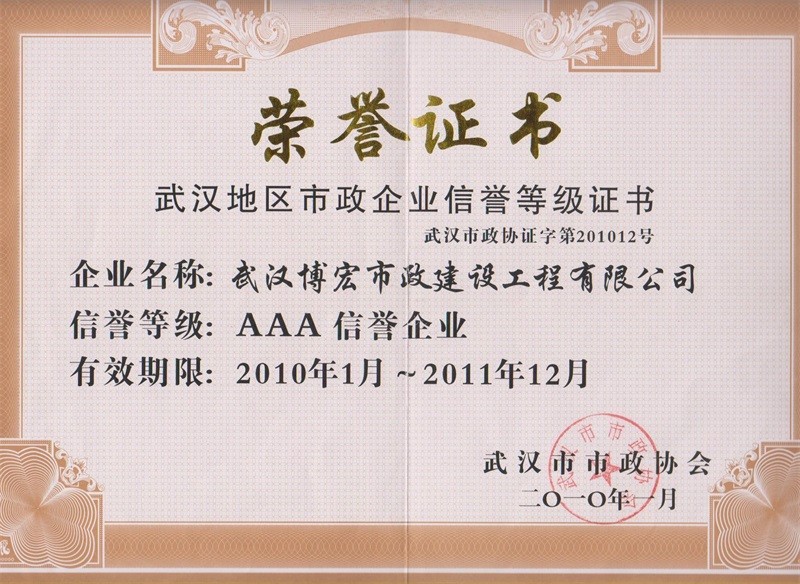 2010-2011年度武漢地區(qū)市政企業(yè)信譽(yù)等級(jí)證書