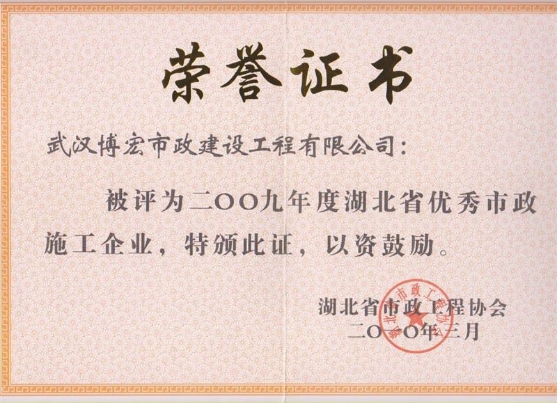 2009年度湖北省優(yōu)秀市政施工企業(yè)