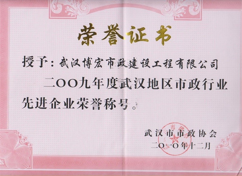 2009年度武漢地區(qū)市政行業(yè)先進(jìn)企業(yè)榮譽(yù)稱號(hào)