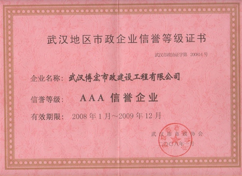 2008-2009年度武漢地區(qū)市政企業(yè)信譽(yù)等級(jí)證書(shū)(AAA信譽(yù)企業(yè))