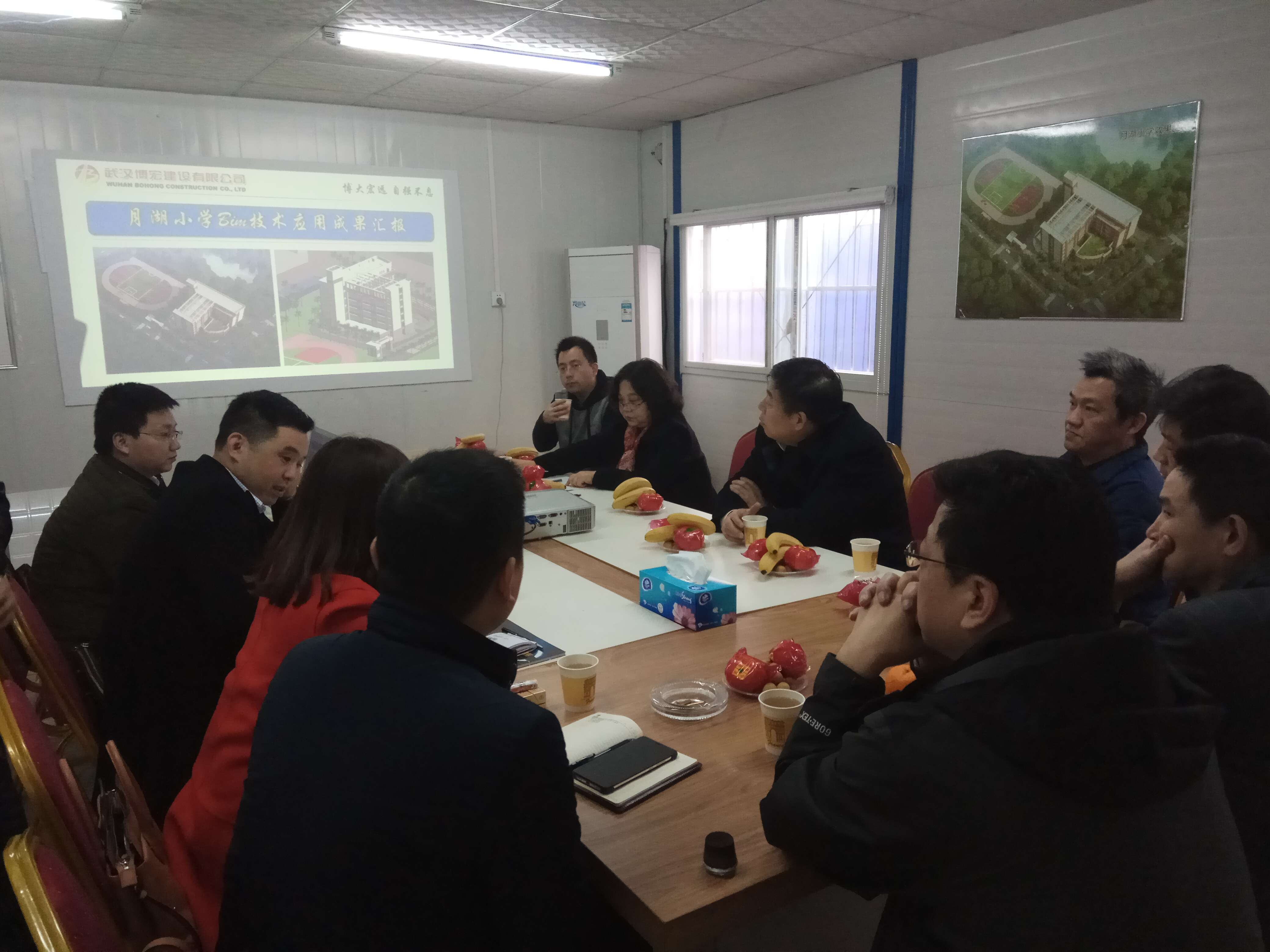 考察交流會(huì)議上為加強(qiáng)雙方了解,公司經(jīng)營(yíng)副總蘇琦首先就公司近年來(lái)發(fā)展及資質(zhì)情況進(jìn)行了簡(jiǎn)單介紹。接下來(lái)公司副總工程師梅浩對(duì)BIM技術(shù)在月湖小學(xué)施工建設(shè)中取得的效果進(jìn)行了概述??偣まk文志勇從圖紙審查、碰撞檢查、可視化交底、砌體排磚、進(jìn)度質(zhì)量安全管理、施工模擬等多個(gè)方面一一介紹BIM技術(shù)為月湖小學(xué)工程建設(shè)帶來(lái)的成果及效益,總結(jié)了BIM技術(shù)應(yīng)用經(jīng)驗(yàn),并簡(jiǎn)單介紹了下一步BIM應(yīng)用計(jì)劃安排。