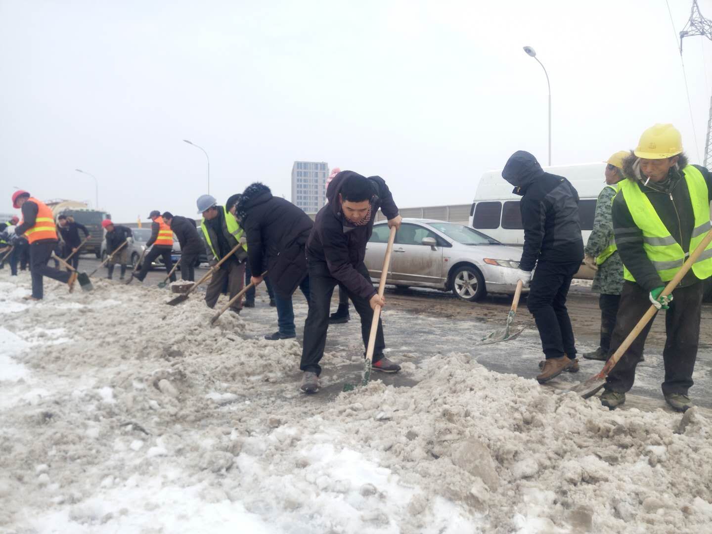 1月28日,公司廣大職工不畏低溫嚴(yán)寒,來(lái)到三環(huán)線(龍陽(yáng)大道~漢陽(yáng)大道)路段,繼續(xù)奮戰(zhàn),男女齊上陣。期間,漢陽(yáng)區(qū)委書(shū)記馬澤江、集團(tuán)公司董事長(zhǎng)嚴(yán)悌文等領(lǐng)導(dǎo)來(lái)到現(xiàn)場(chǎng)指揮工作,為廣大建設(shè)者鼓勁兒加油,下午2點(diǎn),基本完成主干道清掃,車(chē)輛予以通行,截至5點(diǎn),徹底完成三環(huán)線(龍陽(yáng)大道~漢陽(yáng)大道)路段的積雪清掃工作。隨后,鏟雪隊(duì)伍搶抓時(shí)間,來(lái)不及休息便再一次來(lái)到琴臺(tái)大道對(duì)昨夜的積雪進(jìn)行二次清除,進(jìn)一步拓寬快車(chē)道,下午6點(diǎn)30分完成拓寬任務(wù)。