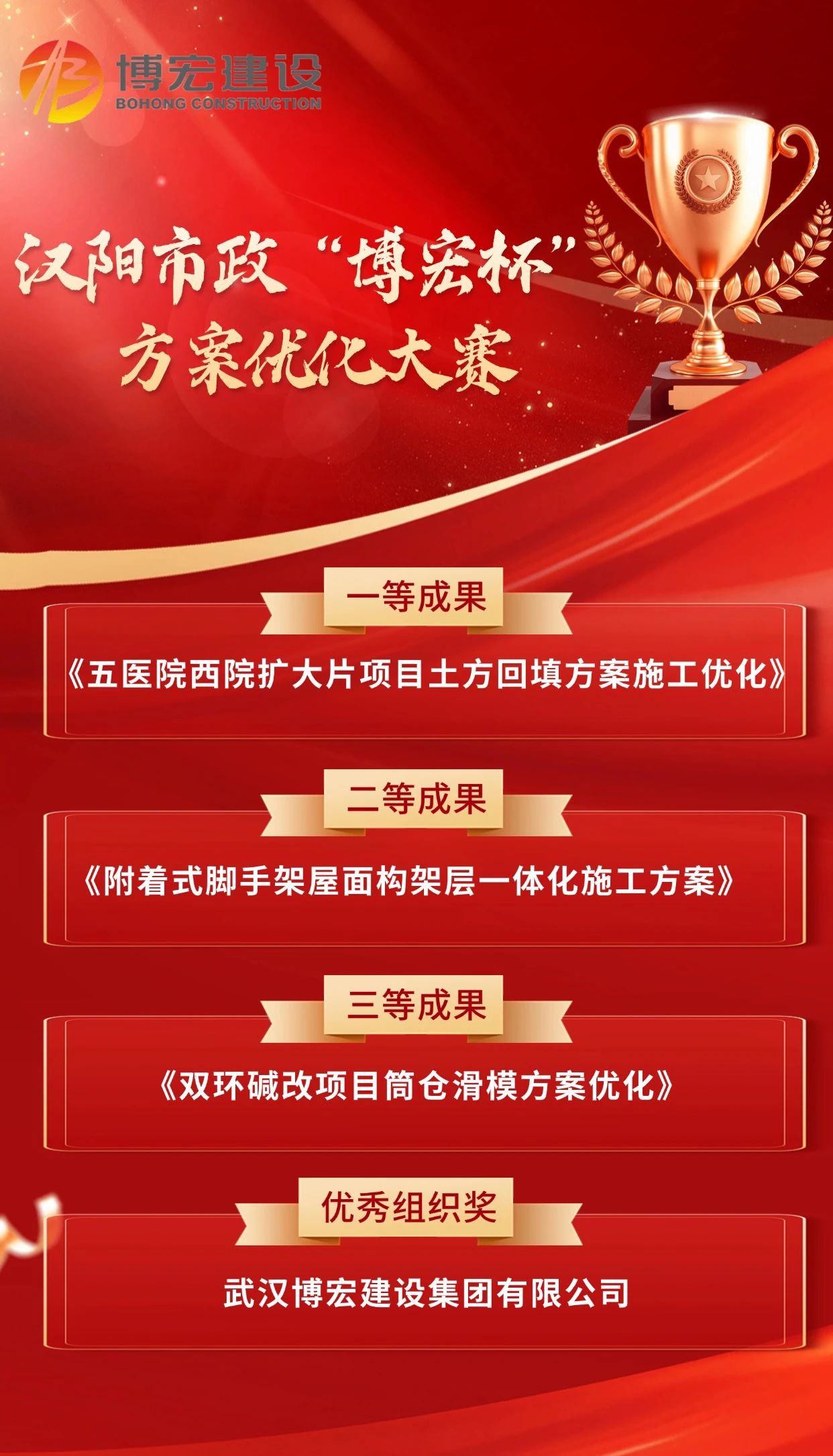 12月24日下午,漢陽市政“博宏杯”方案優(yōu)化大賽在漢陽市政建設大廈205會議室順利舉行,本次比賽以“技術賦能項目生產(chǎn)”為主題,經(jīng)過現(xiàn)場匯報評選,博宏建設集團斬獲1項一等成果,1項二等成果,1項三等成果,與此同時,公司獲評優(yōu)秀組織單位。